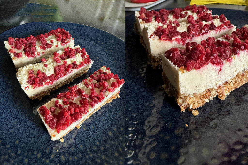 Giet dit over de bodem, strijk glad, besprenkel met een beetje bevroren frambozen en laat opstijven in de vriezer.
